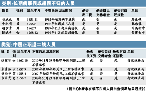 吃空餉的行為將得到清理。 ????昨日,浙江省永康市的市委機(jī)關(guān)報(bào)《永康日?qǐng)?bào)》引起了公眾前所未有的關(guān)注。該報(bào)用了整整兩個(gè)大版,刊登了《永康市在編不在崗人員自查情況結(jié)果通報(bào)》,曝光、公示了該市192名因各種原因“在編不在崗”的機(jī)關(guān)事業(yè)單位工作人員。 ????何謂“在編不在崗”?通俗地說(shuō),就是“占著茅坑不拉屎”,其中甚至不乏領(lǐng)著工資不出工的惡劣情形——即“吃空餉”。這種現(xiàn)象絕不僅僅存在于永康,且多年來(lái)屢禁不止。永康這回動(dòng)了真格,準(zhǔn)備用“自查——公示——舉報(bào)、核查——再公示……”的循環(huán)來(lái)打破各條黑色和灰色的頑固利益鏈。 ????若非永康市委自曝家丑,外人恐怕很難相信竟然有這么多的“公家人”吃了這么多年的“白飯”。這些“白飯”,都是納稅人的血汗錢(qián)。 ????請(qǐng)假請(qǐng)了23年 ????被判刑工資照領(lǐng) ????《永康市在編不在崗人員自查情況結(jié)果通報(bào)》(注:以下簡(jiǎn)稱(chēng)“《通報(bào)》”)的大背景是永康所屬的金華市正在展開(kāi)一場(chǎng)“效能革命”,而“在編不在崗”無(wú)疑是最損害機(jī)關(guān)事業(yè)單位效能的情形之一。被這份《通報(bào)》曝光的機(jī)關(guān)事業(yè)單位工作人員共計(jì)192人,永康市委把他們分成了8大類(lèi)。 ????涉及人數(shù)最多的,是長(zhǎng)期病事假或超假不歸的人員,共69人。這69人中,有57人至今仍領(lǐng)著工資,但具體情況五花八門(mén)。 ????有位姓胡的初中教師,今年50歲,1989年11月,27歲的他因病請(qǐng)假,這個(gè)假一請(qǐng)就是23年。根據(jù)自查結(jié)果,多年來(lái)財(cái)政一直給胡老師撥款發(fā)工資,他也一直領(lǐng)著工資。根據(jù)《通報(bào)》披露的情況,包括胡老師在內(nèi),請(qǐng)假時(shí)間在20年以上的共有3人;請(qǐng)假時(shí)間10年~20年的,共有8人。 ????第二類(lèi),是停薪留職人員,共46人。第三類(lèi),是借用、借調(diào)、抽調(diào)人員,共23人。第四類(lèi),是“上班不夠正?!钡闹袑诱毻硕€人員,共9人,均來(lái)自行政執(zhí)法局。 ????第五類(lèi)是刑事處罰的人員,共7人。7人中有兩人被判處緩刑,財(cái)政仍在撥款,兩人仍領(lǐng)著工資;此外還有兩人領(lǐng)取生活費(fèi)。第六類(lèi),是在家待崗人員,共8人。 ????第七類(lèi),是未辦理辭職擅自離崗人員,共10人。其中有位姓胡的教研室原工作人員,2006年3月便已離開(kāi)單位,但直至今年的4月份,財(cái)政仍撥款發(fā)放他的工資,工資未被領(lǐng)走,由核算中心暫存本單位賬戶。另有位姓胡的女士,2010年9月從職技校擅自離開(kāi),此后財(cái)政未再撥款,但她直到今年的1月份才被學(xué)校停發(fā)工資。 ????第八類(lèi),是“其他情形不在崗的人員”,共20人。 ????教育系統(tǒng)是“在編不在崗”的重災(zāi)區(qū),共有88人上了《通報(bào)》。永康市紀(jì)委書(shū)記藍(lán)群英對(duì)此頗為不滿:“據(jù)我所知,永康教育系統(tǒng)臨時(shí)聘用的人數(shù)達(dá)到700多人,卻有這么多在編教師不上崗授課。” ????嚴(yán)打“拿錢(qián)不干事” ????謊報(bào)病事假要開(kāi)除 ????在《通報(bào)》開(kāi)頭,永康市委這樣介紹自查的深層次原因:“近幾年來(lái),少數(shù)機(jī)關(guān)事業(yè)單位工作人員以各種理由或借口脫離工作崗位,拿錢(qián)不干事,占編不在崗,嚴(yán)重干擾和影響了機(jī)關(guān)事業(yè)單位正常的工作秩序?!?/p> ????永康市紀(jì)委效能辦公室向記者介紹,永康之所以開(kāi)展對(duì)“在編不在崗”人員的檢查工作,也是基于民間的風(fēng)言風(fēng)語(yǔ)。 ????“日常工作中確實(shí)聽(tīng)到有人說(shuō)某些人‘不上班卻照領(lǐng)工資’以及‘正式工不上班,臨時(shí)工上班’,因此,我們打算做一次摸底。雖然以前也開(kāi)展過(guò)類(lèi)似的工作,但從未采用過(guò)公示這種公開(kāi)的方式,也從未上升到市級(jí)重要工作的層面,結(jié)果都不徹底。”工作人員坦言。 ????當(dāng)?shù)匾幻麢C(jī)關(guān)干部告訴記者:“有的人常年領(lǐng)著工資不上班,導(dǎo)致單位作風(fēng)渙散,遲到、早退領(lǐng)導(dǎo)不敢批評(píng)。領(lǐng)導(dǎo)一批評(píng),就難保有人嘴硬:‘那誰(shuí)誰(shuí)誰(shuí)連班都不上,我遲到一會(huì)兒算什么?’” ????永康市紀(jì)委書(shū)記藍(lán)群英向記者介紹,此次檢查涉及100多個(gè)部門(mén),各單位自查后填寫(xiě)表格上報(bào),然后在《永康日?qǐng)?bào)》上公示。在地方黨報(bào)上公布舉報(bào)電話,一方面是希望進(jìn)一步收集已公示人員的信息,另一方面是希望有人舉報(bào)“漏網(wǎng)之魚(yú)”。 ????公示舉報(bào)期為一周,一周后根據(jù)舉報(bào)情況再核查,再公示,再處理,預(yù)計(jì)整項(xiàng)工作在6月底前結(jié)束?!坝行﹩挝灰詾槲覀儭哌^(guò)場(chǎng)’,所以存在瞞報(bào)、少報(bào)。但我們這次下決心要徹查,在這次公示之后,我們會(huì)根據(jù)舉報(bào)核查的情況再進(jìn)行新的公示,一遍遍地公示,才能徹查,才能盡可能地做到無(wú)瞞報(bào)、無(wú)漏報(bào)?!彼{(lán)群英說(shuō)。 ????目前看來(lái),這場(chǎng)行動(dòng)的主要阻力仍是個(gè)別機(jī)關(guān)事業(yè)單位的隱瞞