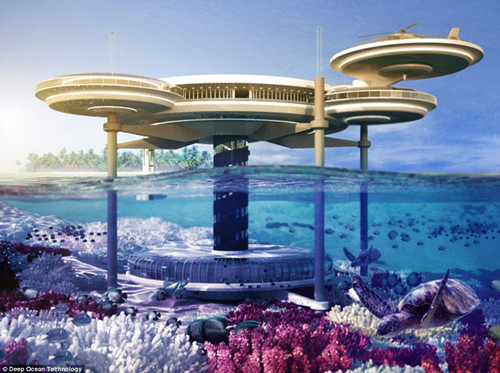 該酒店的外形就像是一艘宇宙飛船,水下部分位于水下10米處,與水上的另一個(gè)圓盤(pán)形狀建筑連通。酒店有21間客房,旁邊則是浸在水中的潛水中心和一個(gè)酒吧。一個(gè)特別的照明系統(tǒng)將照亮外面的動(dòng)植物。如果遇到危險(xiǎn),水下的房間將能上浮。