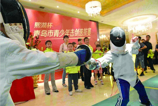 ??? 青島新聞網(wǎng)今日訊 “熙湖杯”青島市青少年擊劍選拔賽今天上午在位于南京路的熙湖接待中心舉行,本次比賽從4月6日開(kāi)始,200個(gè)青少年擊劍愛(ài)好者經(jīng)過(guò)多輪預(yù)賽后32名小選手脫穎而出,在比賽中身著擊劍服相互切磋,頗具劍客風(fēng)范。 ??? 據(jù)比賽主辦方人員介紹,本次參賽的小選手都是由中國(guó)第一位國(guó)際擊劍比賽獎(jiǎng)牌獲得者王勇教練進(jìn)行指導(dǎo),這32名選手中將有10名人進(jìn)入青島耀翔擊劍俱樂(lè)部,在今后的國(guó)內(nèi)比賽中將有機(jī)會(huì)代表青島市出戰(zhàn)。