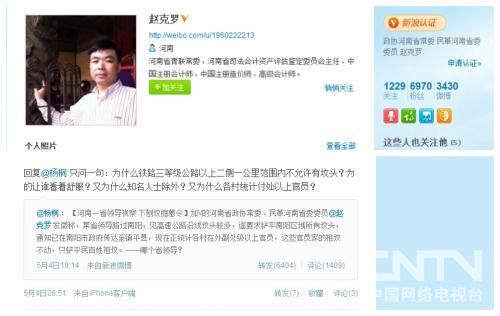 從5月3日發(fā)了第一篇微博開始,個(gè)人簡介為河南政協(xié)常委、民革河南省委員的網(wǎng)友“趙克羅”關(guān)于南陽平墳的微博就沒有停過。他發(fā)的關(guān)于平墳微博廣為擴(kuò)散,網(wǎng)友楊桐的轉(zhuǎn)載更是被轉(zhuǎn)發(fā)6000多次。