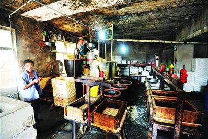 昨天下午2時(shí)許,記者再次來到這處作坊外,此時(shí)其中一家作坊的廠房大門敞開,工人們已經(jīng)開工了,而另一家作坊的煙囪雖然冒著黑煙,但大門卻緊鎖著。記者隨即將情況反映給了嶗山區(qū)食安辦,嶗山質(zhì)監(jiān)分局執(zhí)法人員立即趕到了現(xiàn)場(chǎng)。在左邊的加工作坊內(nèi),兩名工人正在做豆腐。雖然廠房內(nèi)熱氣騰騰,但是卻遮不住布滿霉點(diǎn)的墻壁,墻頂烏黑斑駁,空中不時(shí)有一群蒼蠅飛來飛去,地面上污水橫流,小狗不時(shí)跑來湊熱鬧。