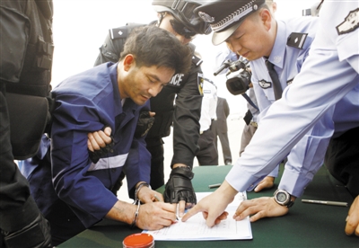 在首都機(jī)場當(dāng)場在《逮捕證》上簽字。 (新華社發(fā))