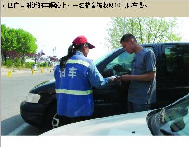 ![]() ???■現(xiàn)場1 地點(diǎn):五四廣場附近豐順路停車場收費(fèi)員張口就要10元 ????昨天下午2時(shí)許,記者來到五四廣場附近的東海路、豐順路路口,根據(jù)市民反映,此路段亂收費(fèi)的情況比較嚴(yán)重,往往是停車線內(nèi)、線外都要收費(fèi),而且每車10元錢,有時(shí)還不給發(fā)票。記者在此處等了一會(huì),一輛掛著河北牌照的藍(lán)色別克商務(wù)車開到此處,一名女收費(fèi)員示意對(duì)方停車,并指揮這輛車將后輪倒上了人行道。駕車男子下車后,這名收費(fèi)員表示“停車10元”,對(duì)方一邊還價(jià)一邊拿出10元錢給了對(duì)方,并索要了一張發(fā)票。 ????“你看看這個(gè)發(fā)票,蓋了個(gè)物業(yè)管理公司的章,根本看不出是停車發(fā)票來?!边@名姓李的河北游客告訴記者,自己是來旅游的,雖然明知這個(gè)收費(fèi)有問題,但也不愿意惹麻煩耽誤事。 ????記者隨后返回停車場,發(fā)現(xiàn)整個(gè)停車場也看不到關(guān)于收費(fèi)標(biāo)準(zhǔn)的公示牌,而且收費(fèi)人員為了在線內(nèi)停下更多的車輛,還都將車輛指揮上了人行道。 ????