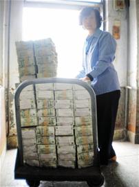 整理完后,她們要把紙幣打包,1000元一摞,放在車上推走,兩三摞堆起來,大約有一米多高。