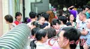 昨天上午9時多,家長在白云區(qū)云景花園培英實驗小學(xué)門外等待報名。 記者駱昌威 攝