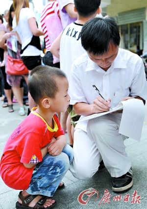 在赤沙小學(xué)門口,一位家長蹲下來填表,孩子也蹲在一旁看。 記者駱昌威攝