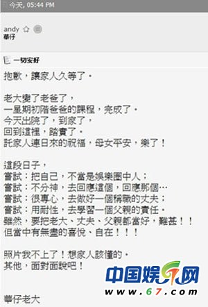 從華仔的留言中,不難看出,這一個禮拜,華仔在努力地將自己還原成一個最平凡的父親,嘗試遠離娛樂圈,所以謝絕一切媒體與圈里好友的探訪,“不分神、很專心、用耐性”地去做一個稱職、有責任的丈夫與父親。