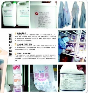????5月10日上午領(lǐng)完工作服,車(chē)間工作人員就曾帶著記者來(lái)到配料室,讓記者等候生產(chǎn)經(jīng)理分配崗位。配料室并不大,當(dāng)時(shí)只有一位夜班工人在等候交接班。記者看到,各種配料已經(jīng)碼成好幾堆。記者仔細(xì)看了看,發(fā)現(xiàn)配料室里幾乎全是添加劑,包括一袋袋甜蜜素、成桶的草莓香精、用作甜味劑的阿斯巴甜 、食用葡萄糖等,印象中制作冰糕所需要食用的牛奶等常用食品或原料記者沒(méi)有看到,只發(fā)現(xiàn)了幾筐雞蛋。