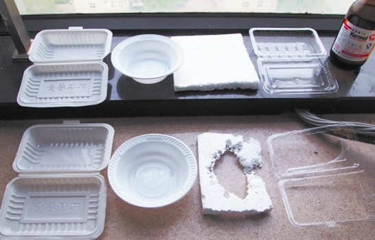 ????隨后,記者又從一處化學(xué)器材專(zhuān)賣(mài)店買(mǎi)到了“乙酸乙酯”溶劑,是一種無(wú)色透明的液體。記者將采購(gòu)來(lái)的PS飯盒、PP飯盒、塑料碗、發(fā)泡塑料等作為實(shí)驗(yàn)對(duì)象,看這些飯盒接觸乙酸乙酯溶劑后究竟會(huì)發(fā)生什么反應(yīng)。