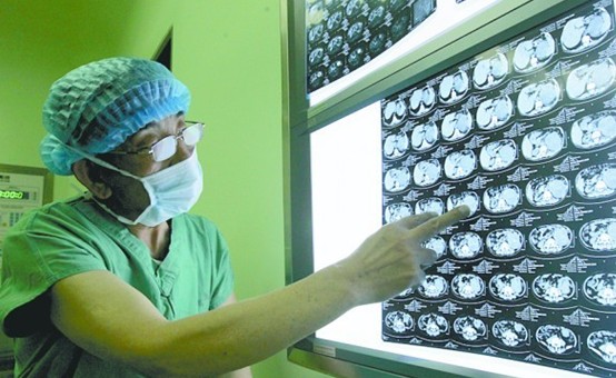 醫(yī)生通過CT拍的片子分析患者長的巨大腎腫瘤。