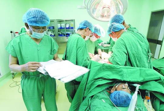 一進(jìn)入手術(shù)室,記者就立刻感受到其中緊張的氣氛。4名醫(yī)生正圍著病人忙碌,旁邊一名護(hù)士根據(jù)指令不停地遞著器械。手術(shù)臺上的患者被手術(shù)布給遮擋住了,看不清相貌,只是旁邊一臺大型檢測儀器上的數(shù)字在不斷變化,顯示有一個生命正在醫(yī)生的雙手下期待奇跡。“心跳、血壓都要監(jiān)控,還有病人手術(shù)中輸血、輸液很多,必須要監(jiān)控其中心靜脈壓,以防心臟的負(fù)擔(dān)太重?!毖不刈o(hù)士王海蕊說。
