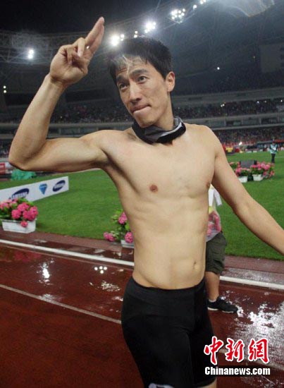 劉翔在沖過(guò)重點(diǎn)顯得十分興奮,他撕掉了運(yùn)動(dòng)服