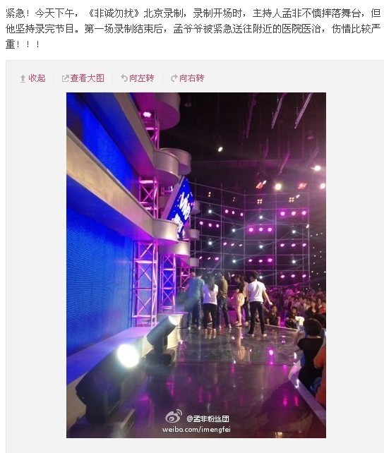 5月19日下午,微博名“孟非粉絲團”的一條微博引發(fā)了媒體關(guān)注:孟非在京錄制《非誠勿擾》的過程中不慎跌落舞臺,并稱其傷勢十分嚴重。事發(fā)第二天,負責(zé)該欄目宣傳的張先生證實了此消息屬實,“經(jīng)確診是左手臂手肘關(guān)節(jié)部位骨折,已經(jīng)打了石膏。當(dāng)時是挺嚴重,不過現(xiàn)在孟非老師的狀態(tài)好很多,他還要堅持錄完今天的兩場?!?/p>