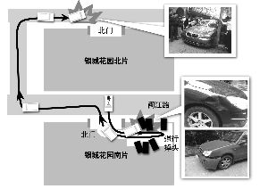 大家分析,寶馬車司機(jī)可能先在南片小區(qū)內(nèi)撞壞多輛汽車,然后開出小區(qū),路上又撞壞幾輛轎車。然后他將車開到北片小區(qū)北門外的人行道上,撞到行道樹后,下車離去。