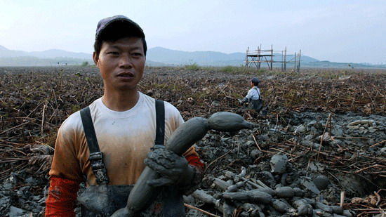 攝影師的鏡頭一路跟隨職業(yè)挖藕人圣武和茂榮兄弟倆。“每年9月,他們都會(huì)來(lái)到湖北的嘉魚(yú)縣,來(lái)采挖一種自然的美味。這種植物生長(zhǎng)在湖水下面的深深的淤泥之中,是一種湖泊中高產(chǎn)的蔬菜——藕?!逼薪榻B,藕的營(yíng)養(yǎng)價(jià)值高,美味爽口,挖出來(lái)卻非易事,需置身于冰冷的淤泥里用手挖,這要求挖藕人不僅力大,還要使“巧勁兒”,否則挖斷了的藕賣(mài)不到好價(jià)錢(qián)。“整整一湖的蓮藕還要采摘5個(gè)月的時(shí)間,在嘉魚(yú)縣的珍湖上,300個(gè)職業(yè)挖藕人,每天從日出延續(xù)到日落,在中國(guó)遍布淡水湖的大省,這樣的場(chǎng)面年年上演。”