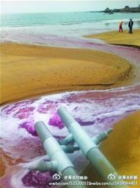 ????近日,有多位青島市民通過晚報熱線82860085向記者反映,嶗山王哥莊街道峰山后村附近的一處海灘上,有兩根管道在往海中排污:紅色的污水不經(jīng)任何處理嘩啦啦地流向大海,將300多米長的海灘染成了紅白相間。