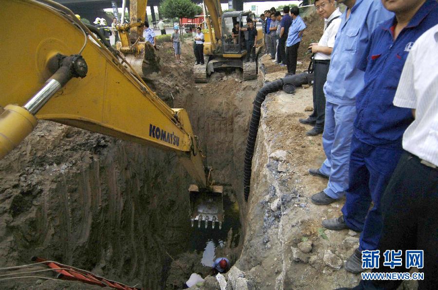 5月25日,工作人員在搶修被挖斷的輸油管道。新華社記者郭緒雷攝