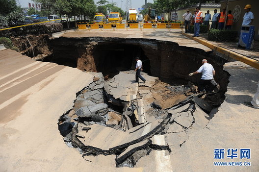 2012年5月27日,陜西省西安市朱宏路和北二環(huán)十字往北600米左右,機電市場對面路面突然塌陷,記者在現(xiàn)場看到,路面塌出一個長約15米,寬約10米,深約6米的大坑??又杏幸粋€直徑約1米的管道斷裂,斷裂層厚度約10厘米,露出銹跡斑斑的鋼筋,在斷裂管道的右上方有一個直徑約20厘米的管