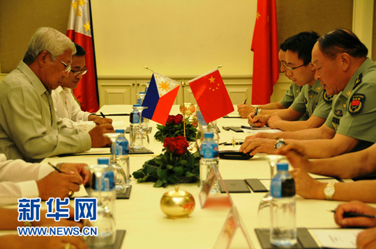 ????5月28日,中國(guó)國(guó)務(wù)委員兼國(guó)防部長(zhǎng)梁光烈上將(右一)與菲律賓國(guó)防部長(zhǎng)加斯明(左一)在柬埔寨首都金邊舉行會(huì)談。國(guó)務(wù)委員兼國(guó)防部長(zhǎng)梁光烈上將當(dāng)日在金邊應(yīng)約會(huì)見(jiàn)了正在柬埔寨參加?xùn)|盟防長(zhǎng)會(huì)的菲律賓國(guó)防部長(zhǎng)加斯明,雙方就雙邊關(guān)系及共同關(guān)心的問(wèn)題交換了意見(jiàn)。新華社發(fā)(塔納克儂攝)