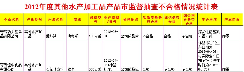 ????為了保證食品安全,根據(jù)《中華人民共和國(guó)產(chǎn)品質(zhì)量法》、《中華人民共和國(guó)食品安全法》、《產(chǎn)品質(zhì)量國(guó)家監(jiān)督抽查管理辦法》和《山東省食品監(jiān)督檢驗(yàn)工作規(guī)范(試行)》等規(guī)定,為正確履行質(zhì)監(jiān)部門生產(chǎn)加工環(huán)節(jié)食品質(zhì)量安全監(jiān)管職能,促進(jìn)行業(yè)健康發(fā)展,維護(hù)廣大消費(fèi)者的合法權(quán)益,我局組織開(kāi)展了其他水產(chǎn)加工品產(chǎn)品質(zhì)量監(jiān)督抽查,現(xiàn)將抽查結(jié)果予以公布。 ????本次共抽查了17家企業(yè)的17批其他水產(chǎn)加工品產(chǎn)品,26家企業(yè)未抽到樣品。依據(jù)GB 10132-2005《魚糜制品衛(wèi)生標(biāo)準(zhǔn)》、GB 10133-2005《水產(chǎn)調(diào)味品衛(wèi)生標(biāo)準(zhǔn)》、GB 10136-2005《腌制生食動(dòng)物性水產(chǎn)品衛(wèi)生標(biāo)準(zhǔn)》、SC/T 3502-2000《魚油》、SC/T 3503-2000《多烯魚油制品》、SC/T 3601-2003《蠔油》、SC/T 3602-2002《蝦醬》、SC/T 3902-2001《海膽制品》、SC/T 3905-1985《鱘、鰉魚籽》、GB 7718-2004《預(yù)包裝食品標(biāo)簽通則》、備案有效的企業(yè)標(biāo)準(zhǔn)等對(duì)感官、氨基酸態(tài)氮、氯化鈉、蛋白質(zhì)、總氮、總酸、總氮與氨基酸態(tài)氮之比、水分、揮發(fā)性鹽基氮、灰分、汞/甲基汞、無(wú)機(jī)砷、鉛、鎘、鋁、多氯聯(lián)苯、苯甲酸、山梨酸、菌落總數(shù)、大腸菌群、沙門氏菌、金黃色葡萄球菌、副溶血性弧菌、志賀氏菌、標(biāo)簽等25項(xiàng)質(zhì)量指標(biāo)進(jìn)行了抽樣檢驗(yàn),其中有1家企業(yè)蜢蝦醬產(chǎn)品的揮發(fā)性鹽基氮、鋁、砷項(xiàng)目不合格,有1家企業(yè)石花菜涼粉產(chǎn)品的標(biāo)簽項(xiàng)目不合格,已按有關(guān)規(guī)定開(kāi)展后處理工作。