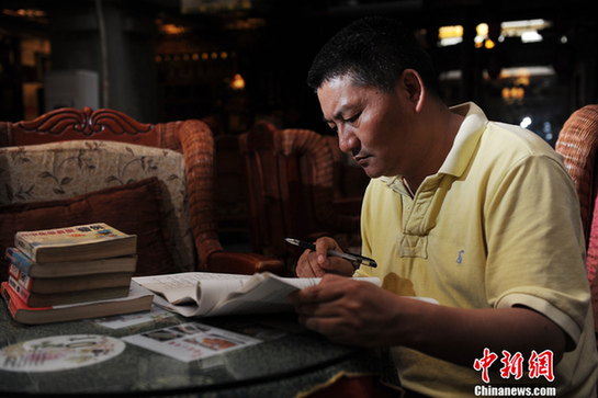 6月2日,被戲稱中國“高考最牛釘子戶”的梁實(shí)在成都一老茶館內(nèi)緊張備戰(zhàn)2012年全國高考,這是他個(gè)人第16次參加全國高校招生考試?,F(xiàn)齡45歲的梁實(shí)每天都要花6個(gè)小時(shí)時(shí)間復(fù)習(xí)功課,到茶館學(xué)習(xí)也是他多年來養(yǎng)成的一種習(xí)慣。梁實(shí)表示,若今年還不能考進(jìn)理想中的大學(xué),2013年還將繼續(xù)奮斗。圖為在茶館內(nèi)復(fù)習(xí)的梁實(shí)。