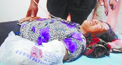 ????記者隨后趕到解放軍401醫(yī)院急診室,還沒走進急診室就聽見里面?zhèn)鞒鰜硗纯嗟暮奥?。記者看到傷者躺在病床上,左?cè)胳膊手肘以下沒有了手臂,斷口處纏著厚厚的繃帶,但鮮血仍然浸透了繃帶,滲到床單上。滿頭大汗的劉女士痛苦地扭曲著身子,不停地痛哭慘叫。而在床邊圍著的幾個人盡管眼里噙著淚珠,但仍使勁摁住她的右手和腿,不讓她亂動以免加劇傷口疼痛。