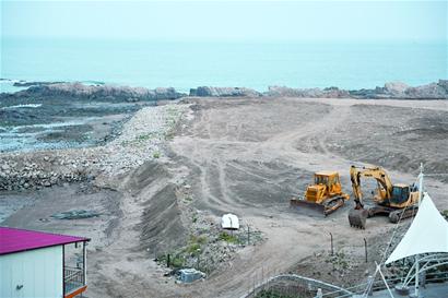 ????“陸地廣場”東北角岸邊的“紅房子”已有了強拆規(guī)劃,但是“紅房子”前面用石塊和砂土違法建起的海壩,以及由此形成的小片“內(nèi)?!眳s依然存在,沒有清除?,F(xiàn)場盡管有幾輛挖掘機停留,但沒有施工的跡象。