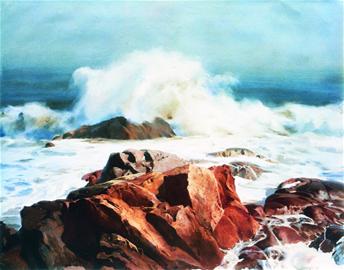 ????“我在海邊長大,在海邊住了很多年,工作也在海邊。在我的眼里,青島就是大海,大海就是紅礁石。這是青島一個獨特的地理現(xiàn)象,也是藍(lán)色文化的一部分。青島的紅礁石顏色亮麗,有棱有角,粗獷剛勁,是畫家天然的表現(xiàn)對象?!庇谄諠嵳f。