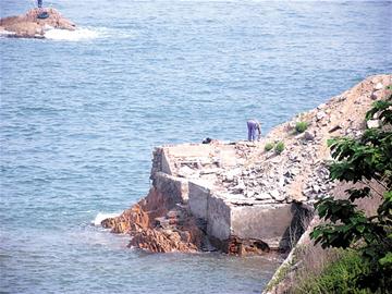 ????“陸地廣場”往東200米左右,離岸邊稍遠(yuǎn)一點的礁石上,看海小屋留下的基座遺跡和電線桿等依舊清晰可見,而岸邊游人嬉戲的地方也有一處約4米見方的建筑遺跡。繼續(xù)向東100多米,之前被極地金岸某業(yè)戶非法圈占“裝修”的礁石上,欄桿、澆筑的水泥等都已被清除掉,礁石也逐漸恢復(fù)了原來的面貌。但在礁石周圍原來就存在的建筑遺跡依然,許多建筑垃圾也散落在附近的礁石上,清理工作并不徹底。