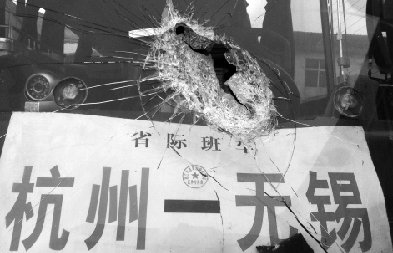 大客車的擋風(fēng)玻璃上,安放著兩塊牌子,一是“杭錫平安文明線”,一是“省際班車,杭州-無錫”。被飛來鐵片擊中的部位處于“杭州-無錫”牌子的正上角,剛好對準(zhǔn)的是方向盤。一條狹長的小洞,破損向外擴(kuò)散成蜘蛛網(wǎng)狀的“傷疤”。