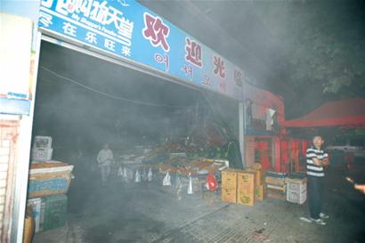 是水果和雜貨攤位,內(nèi)部則由一道玻璃門(mén)隔開(kāi),由于現(xiàn)場(chǎng)濃煙很大,地面上又積滿了水,里面的情況無(wú)法看清。