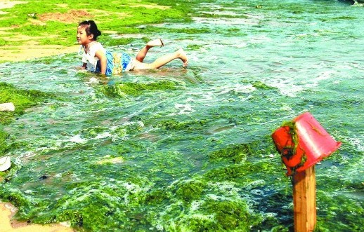 ????6月5日,出現(xiàn)在第三海水浴場(chǎng)和第六海水浴場(chǎng)的滸苔明顯比前一天增加。當(dāng)天上午,記者從國(guó)家海洋局北海分局了解到,根據(jù)4日對(duì)黃海綠潮的監(jiān)測(cè)結(jié)果顯示,滸苔綠潮已經(jīng)靠近青島市區(qū)。