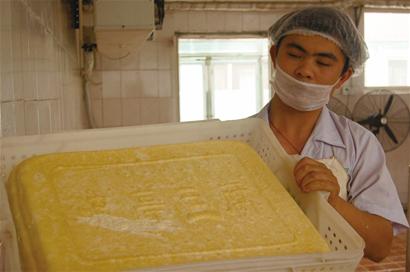 ????“因靠近批發(fā)市場,流亭轄區(qū)滋生了大量的豆制品小作坊,且普遍存在臟、亂、差的現(xiàn)象,監(jiān)管難度很大?!背顷柺嘲厕k工作人員說,從去年開始,他們對豆制品小作坊展開治理。經(jīng)調(diào)查發(fā)現(xiàn),90%的小作坊主希望合法經(jīng)營,于是在有關(guān)部門的協(xié)調(diào)支持下,去年5月份,個人利用閑置廠房投資400萬,在流亭仙家寨設(shè)立了豆制品加工園區(qū)。目前,已吸引15家業(yè)戶入駐,日生產(chǎn)豆制品近兩萬斤。