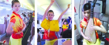 ????上午9點(diǎn)50,一切準(zhǔn)備就緒:兩位表演樂器的空姐換上了旗袍裝,兩位跳舞的空姐拿好道具。乘務(wù)長(zhǎng)陸小卉一聲“開始!”演出開始了。正在客艙里昏昏欲睡的乘客被眼前的一幕“靚”醒了,紛紛把相機(jī)舉過頭頂,拍下這精彩的一幕。