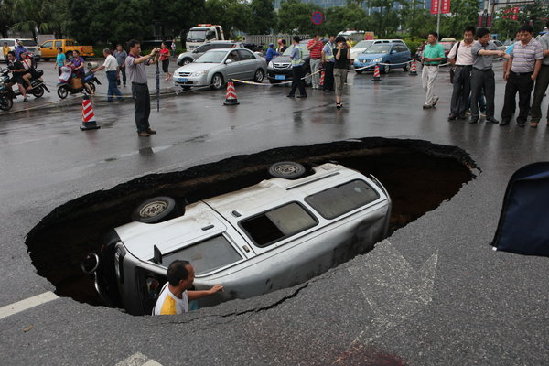 2012年6月7日凌晨約4:00時(shí),廣西桂林市區(qū)地處上海路與輔星路交匯處的輔星路南端,發(fā)生一起道路塌陷事故,一輛哈飛小車不幸陷入其中。路面塌陷處呈酒缸型大洞,洞內(nèi)長約4米,寬2.5米,深2米左右,洞內(nèi)面積約20平方米。由于地處交通要道,十分危險(xiǎn),市轄區(qū)政府、交警、交通