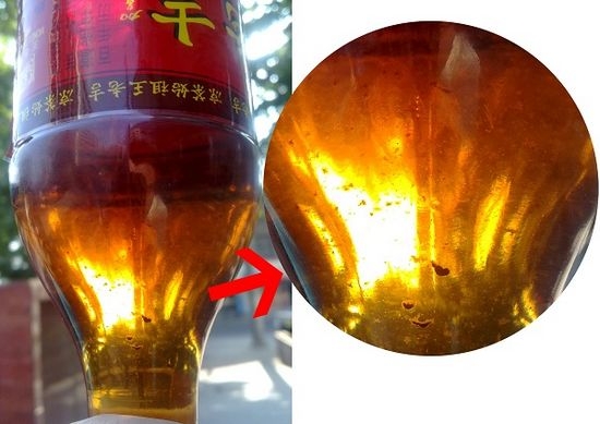 ????記者看到劉先生帶來(lái)的王老吉瓶裝飲料封口完整,里面的確出現(xiàn)了大量雜質(zhì),透過陽(yáng)光的照射不難發(fā)現(xiàn),雜質(zhì)中還有不少大顆粒的黑色物質(zhì)。