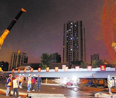 9日晚11時(shí)30分許,過(guò)街天橋橋體開(kāi)始被兩輛吊車吊裝(記者 王濱)