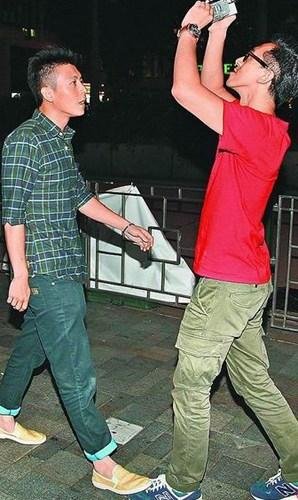 陳冠希(左)面帶殺氣踩記者腳,作勢要擋住鏡頭。