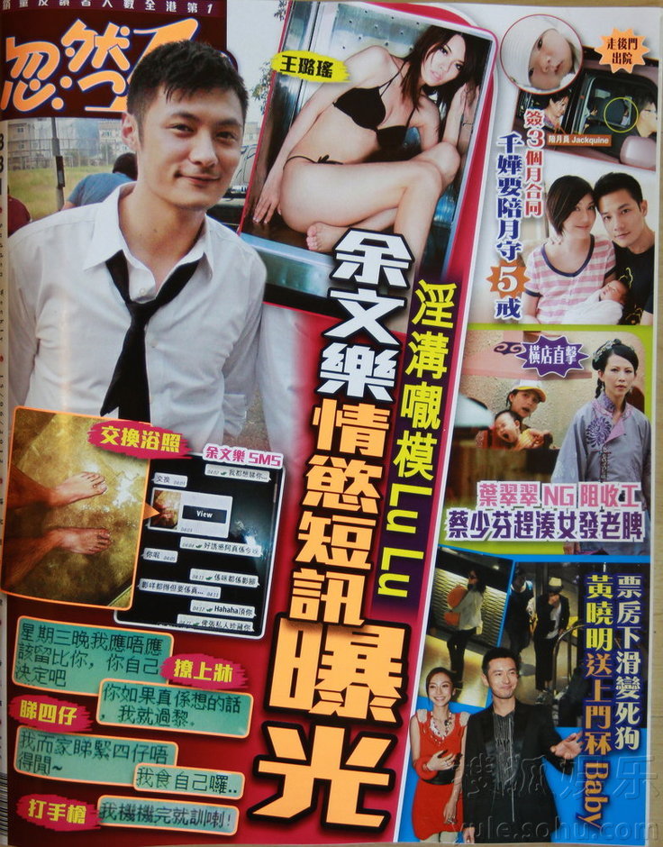 近日,香港八卦周刊曝光疑似余文樂(lè)與靚模王璐瑤(LuLu)露骨手機(jī)短信,稱兩人自08年合拍電影后便開始地下情。同時(shí),該周刊還曝光余文樂(lè)深夜駕車街頭夜會(huì)另一靚模顏后君Ceci的照片,令一直單身的余文樂(lè),個(gè)人感情問(wèn)題撲朔迷離。以下為該周刊文章節(jié)選:最近本刊收到一批由余文樂(lè)電話發(fā)出的短信訊息,據(jù)知該批短信是屬于余文樂(lè)與靚模LuLu(王璐瑤)所有,內(nèi)容大膽露骨。不過(guò)余文樂(lè)也玩得很小心,只要求去女方家或在自己寓所見(jiàn)面。自從08年與黃伊汶分手后,余文樂(lè)一直自稱單身,而大家也都以為他鐘情比自己年長(zhǎng)的女性,不過(guò),原來(lái)他已經(jīng)秘密用短信約會(huì)曾與謝天華傳緋聞的23歲的模特王璐瑤。從這批短信內(nèi)容所見(jiàn),兩人以短信傳情一年多,男方多次邀女方到他寓所聊天,女方則欲拒還迎。不過(guò)余文樂(lè)并未因此放棄,繼續(xù)以“好多玩的,好多樂(lè)趣、好多刺激”來(lái)挑逗女方,最后終于得到同意。從“你屋企定我屋企”(粵語(yǔ)“你家還是我家”的意思)一句看來(lái),兩人關(guān)系已十分密切。