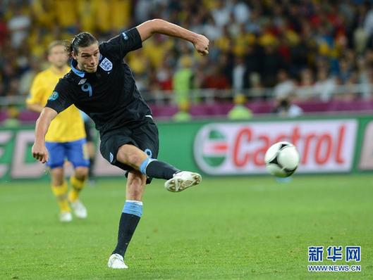 6月15日,英格蘭隊(duì)球員卡羅爾在比賽中射門。當(dāng)日,在烏克蘭首都基輔舉行的2012年歐洲足球錦標(biāo)賽D組第二輪比賽中,英格蘭隊(duì)以3比2戰(zhàn)勝瑞典隊(duì)。