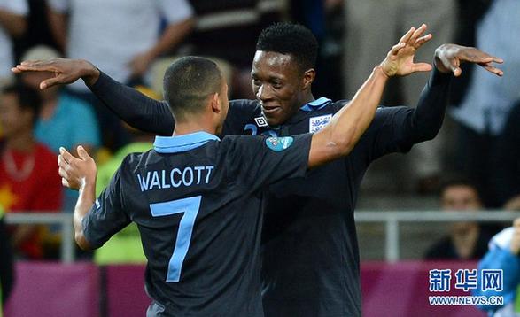 6月15日,英格蘭隊球員維爾貝克(右)與隊友沃爾科特在比賽中慶祝進球。當(dāng)日,在烏克蘭首都基輔舉行的2012年歐洲足球錦標(biāo)賽D組第二輪比賽中,英格蘭隊以3比2戰(zhàn)勝瑞典隊。