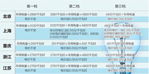 據(jù)介紹,從7月1日起,江蘇居民生活用電將試行階梯電價。階梯電價按年度為周期執(zhí)行后,年用電量不超過2760度的家庭,電費不變;年用電量超過2760度,但未達到4800度之間的電量,超出部分每度在第一檔電價基礎上加價0.05元;年用電量超出4800度的部分,每度在第一檔電價基礎上加價0.3元。