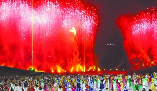 ????最激動人心的時刻在當(dāng)晚9時30分許到來。5名火炬手依次帶著從上屆亞沙會舉辦地馬斯喀特采集來的火種繞場一周后,將最后一棒火炬?zhèn)鬟f給北京奧運會跳水冠軍王峰。王峰慢慢舉起火炬,一個手打燈籠的小姑娘出現(xiàn)在他面前,王峰的火炬和小姑娘的燈籠在空中進(jìn)行了一個象征意義的對接,恰在這時,一只散發(fā)著銀色光芒的“海鷗”從上空飛起,它嘴中的引線已然被火炬點燃。此后,在全場觀眾屏住呼吸的注目中 ,“海鷗”緩緩飛向主火炬塔。頃刻之間,小小的火種點燃引線,萬道火光聚集在一起向前沖去,主火炬瞬間熊熊燃起!