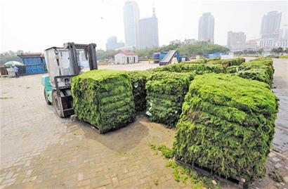 ????“我們中午接到通知,草草吃了午飯就準(zhǔn)備工具,下午2時(shí)到沙灘上清理滸苔。”香港中路街道辦事處的一名居民告訴記者,他們來(lái)時(shí)沙灘上已經(jīng)積攢了不少滸苔,在用叉子、鐵锨等工具將滸苔清理成堆后,將會(huì)有大型鏟車前來(lái)鏟到大貨車上?!皾G苔會(huì)被拉到八大峽廣場(chǎng)用滸苔壓縮機(jī)擠壓脫水?!笔心暇G化工作人員介紹說(shuō)。當(dāng)日,第三海水浴場(chǎng)共清理滸苔300噸左右。