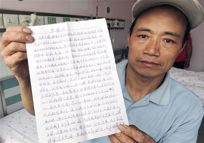 這段時間,來自社會各界的愛心一直包圍著趙祥海這個五口之家,當聽到妻子于曰芳開口說話的消息后,趙祥?;叵肫鹌拮踊疾『蟾腥说囊荒荒粓鼍?,含著熱淚寫下了3頁感謝信。記者將其中部分摘錄下來: