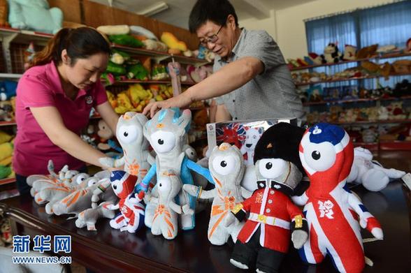 6月19日,兩名工作人員在整理倫敦奧運會和殘奧會吉祥物樣品。