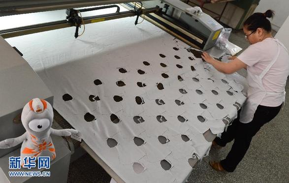 6月19日,一名工作人員使用激光裁剪機裁剪倫敦奧運會吉祥物的制作材料。