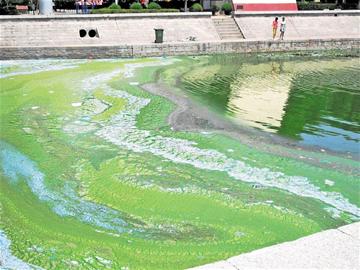 膠南市城建局城鄉(xiāng)水務(wù)管理處池主任介紹,由于珠海路北段的小辛河上面是一個居住區(qū),大量生活污水排進(jìn)小辛河,再加上氣溫升高微生物繁衍,導(dǎo)致藍(lán)藻大量繁殖,目前城建部門已經(jīng)定期派工作人員駕駛船只進(jìn)行打撈,有時還往藍(lán)藻密集區(qū)撒石灰粉,但沒有根治藍(lán)藻的辦法。(記者 趙玉勛 攝影報道)