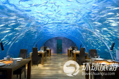 Ithaa餐廳是世界第一家水下餐廳,位于距海平面5米處。該餐廳花費(fèi)5,000,000美元(合人民幣3.2億元)建立了大型的玻璃容器,可供海洋生物在里面自由游動。前來就餐的顧客可通過螺旋梯來到到餐廳包廂,僅設(shè)14座。在那,顧客們即將成為焦點(diǎn),周圍的魚兒、珊瑚、鰭刺甚至鯊魚都游到淺灘來湊熱鬧。但是這些野生動物并不能接觸到用餐者,因?yàn)榇蠹沂腔\罩在一個封閉的藍(lán)色弧形里,他們更想享受碗中的魚。馬爾代夫的轉(zhuǎn)變是體現(xiàn)在海鮮和其他西式風(fēng)味特色上,品味套餐價(jià)值300美元(合人民幣1910元)。在Ithaa餐廳,不光可以享受到黃鰭金槍魚,還可以品嘗到南瓜湯。盡管該餐廳的龍蝦是一大亮點(diǎn),但是并非是指所有的菜肴都屬海鮮類,還有加松露的安格斯牛肉。