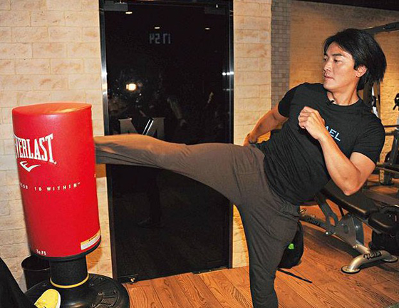 上下兼顧,伊健踢沙包練腳力。